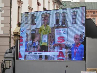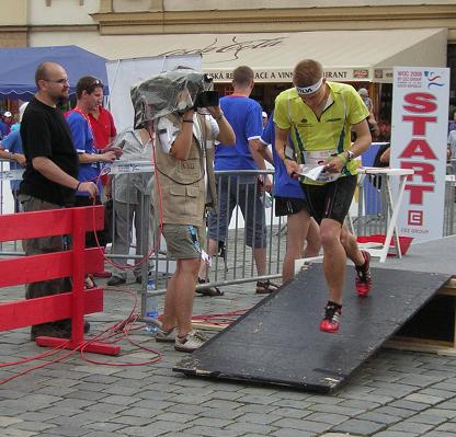 As the Australians were warming down an electrical storm hit the centre of Olomouc and the spectators and organisers were drenched in a short but sharp downpour. As the clouds cleared and the thunder rolled away to the north it seemed the excitement was all over and it would be business as usual for the favourites at the back end of the start list. Then Emil Wingsted ran past a TV control without punching. Everyone in the arena held their breath glued to the big screen watching to see whether Wingsted would realise and turn back. He didn't, and as he crossed the finish line in the lead he was told by the commentator of his disqualification. The cameras hovered over Wingsted as the understanding came and disappointment hit...