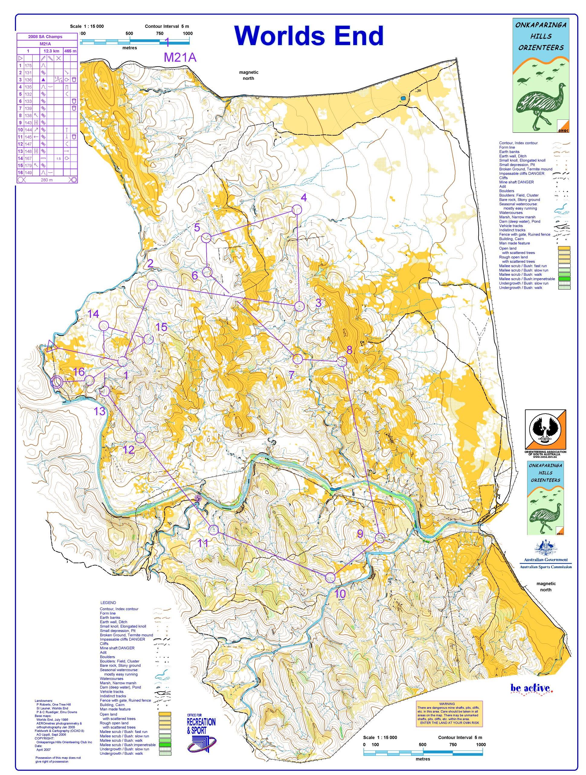 The courses were on the original Worlds End map apart from M21A (see M21A  course) which extended onto the more physical terrain of Worlds End South used at the Australian Three Days in 2007.  Other class winners included Stephen Dose in M35A, Steve Cooper in M45A, Robin Uppill in W45A, and Lance Fairclough in M80A.  The spur gully terrain offered route choice possibilities, with those who were able to maintain map contact, generally mastering the terrain.  The more subtle contours in the early part of some courses invited fast running, but was less forgiving for those not keeping in touch with the map.