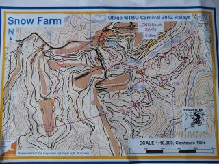 The successful Otago MTBO Carnival finished with a friendly relay yesterday at the Snow Farm, a ski-field high above Cardrona near Wanaka. The rain cleared, the sun came out, though it was a coolish 6 degrees.  Riders tangled with a spaghetti-like maze of benched ski trails and motor vehicle testing tracks. The race format involved 2 person teams taking turns to do 2 loops each.
