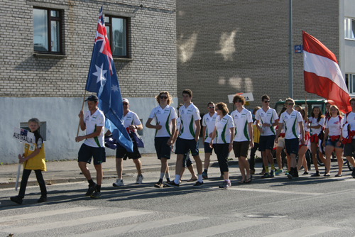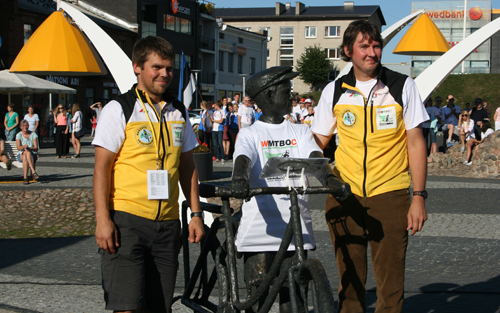 Today saw the Opening Ceremony of the 2013 MTBO WOC and JWOC in the town of Rakvere, Estonia.  The weather turned on a charm and allowed 261 competitors form 26 countries to march into the town centre and witness the opening ceremony. Everyone enjoyed seeing the local statue being transformed from a local boy pushing a bike to suddenly being a mountain bike orienteer.