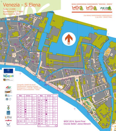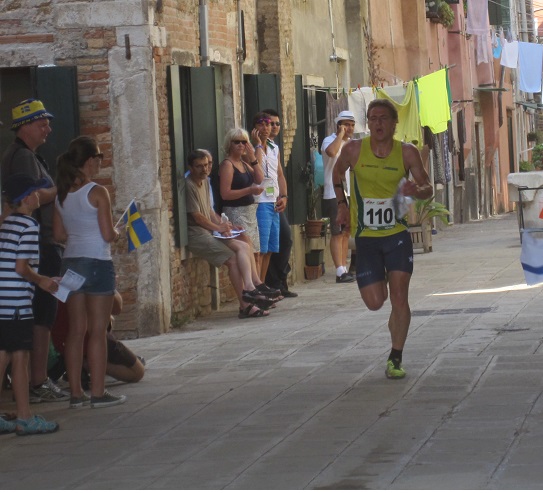 Today saw the beginning of WOC 2014 with a sprint qualification on two small islands some distance from Venice. On a hot and calm day a small group of Aussies travelled early to the small island of Burano to be ready for the first starters in the Women’s qualification. As the commentary was not ready we were kept a little in the dark about the placing as the runners finished in the three womens qualifications. Today was turning out to be a matter of seconds in so many ways. Hanny Allston had a steady run to finish in 7th place, Rachel Effeney had a very strong run in her heat and came in third place only 12 seconds down on the winner. Felicity Brown who was our third runner unfortunately missed out on qualifying for the final by 4 seconds. The times were coming in very close together which indicated that in the men’s qualification every second would count. This is how it turned out with Julian Dent who was running third at the first radio control qualifying for the final by 5 seconds in 12th, dropping two places from the second last control. Lachlan Dow and Simon Uppill both finished in 22nd place but were only 17 seconds and 21 seconds respectively away from qualifying. The commentary was ready for the men’s qualification so we had more of an idea what was happening and it was all happening with three runners starting together and the times being so close.