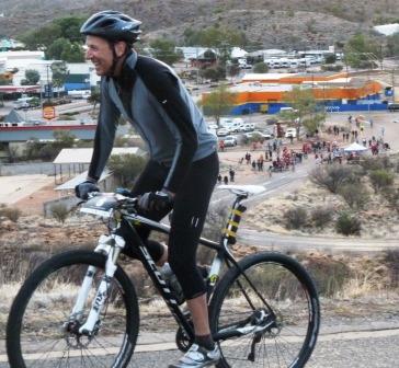 Carolyn Jackson doing a massive PB on the hill climb in Alice Springs stage race. Paul Darvodelsky warming up - 2nd in 50+