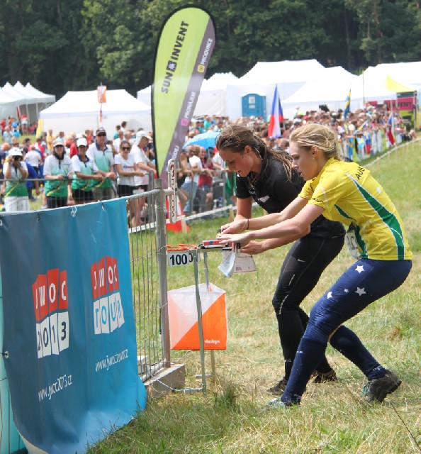 JWOC Relay 2013. What a great day full of excitement and anticipation! It was warm, the Aussie supporters were out in force and the athletes eager to start. First off was the women’s race, mass starting at 10.00am. Lanita and Mary were first to begin and soon disappeared into the forest. Spectators could follow the action and mistakes on the big screen and the race was well commentated. Lanita was the first Aussie to appear and tagged Jacqui who sped off and collected her map from the map change area.